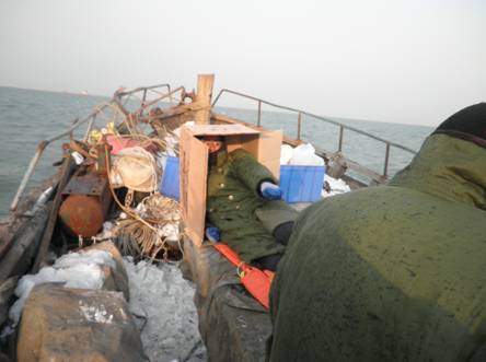 專家點評:擁擠的船艙、堆積的殘雪,體現(xiàn)了海岸帶工作者惡劣的工作環(huán)境和生活狀態(tài),軍大衣后背星星點點的水滴從另一個側(cè)面反應(yīng)了當(dāng)時作業(yè)環(huán)境的惡劣。圖中主人公為了躲避風(fēng)浪,將頭躲到紙箱中,說明了當(dāng)時一種寒冷、疲憊、惡劣到極致的工作現(xiàn)狀,然而,船只依然在顛簸的海面毅然的行駛著,他們在堅持……