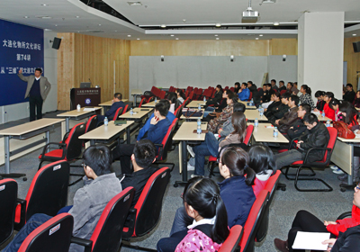 杜輝旁征博引,語言幽默詼諧,從古樸厚重的古城西安,講到博大正統(tǒng)的北京城,再到奢華精致的大上海,通過對比,杜輝提出了大連與眾不同的城市文化特色——明快而務實。而后,他又從“三緣”即業(yè)緣、史緣、地緣三個方面及大連“三民”文化,即殖民、移民、漁民,對大連的文化產(chǎn)業(yè)成就及問題進行了深刻地剖析。