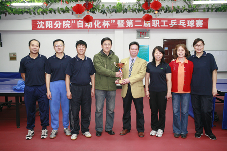 經(jīng)過(guò)男女單項(xiàng)共49場(chǎng)比賽,沈陽(yáng)自動(dòng)化研究所7名隊(duì)員全部獲得積分,有6名隊(duì)員打入男女單項(xiàng)前八名,總成績(jī)列各單位之首,獲得團(tuán)體冠軍。金屬所、大連化物所分獲二三名。沈陽(yáng)分院機(jī)關(guān)工會(huì)主席周峰宣布了比賽成績(jī),沈陽(yáng)分院院長(zhǎng)助理王瑞芬、沈陽(yáng)自動(dòng)化所副所長(zhǎng)梁波、金屬所副所長(zhǎng)張哲峰分別為獲得團(tuán)體一二三名的球隊(duì)頒獎(jiǎng)。