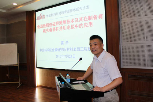 在功能材料與材料表面技術(shù)聯(lián)合沙龍中,材料表面工程研究部的雷浩副研究員作了題為“低溫低損傷磁控濺射技術(shù)及其在制備有機(jī)光電器件透明電極的應(yīng)用”的學(xué)術(shù)報(bào)告。
