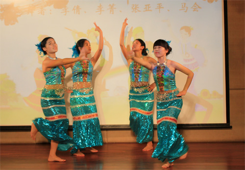 金屬所的同學(xué)表演了繽紛多樣的節(jié)目,有民族舞、樂器演奏、相聲、中國功夫、英語話劇等,充分展現(xiàn)了同學(xué)們的多才多藝。舞蹈《桃花謠》、《一個美麗的地方》盡顯了女生的婀娜多姿;自由搏擊操、雙截棍則彰顯了男生們的血?dú)夥絼?;古箏、二胡、口琴、吉他等樂器演奏,引得現(xiàn)場觀眾掌聲不斷。