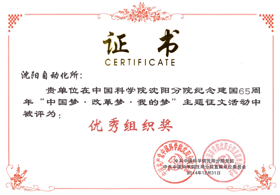 近日,從中國科學(xué)院沈陽分院獲悉,中國科學(xué)院沈陽自動化研究所在2014年參加的沈陽分院紀(jì)念建國65周年“中國夢?改革夢?我的夢”主題征文活動中獲評優(yōu)秀組織獎。由沈陽自動化所選送的6篇作品全部獲獎。