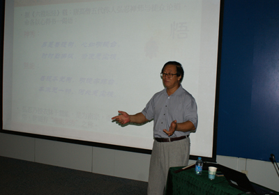 講座中,張志剛為大家首先介紹了佛教在印度的由來和產生過程,分析了佛教之所以能傳入中國并在我國流傳和發(fā)揚的原因,還介紹了位于我國的佛教名山。隨后,他為大家重點講述了佛教的教義和制度,并引出了佛教教派中與中國文化結合最為緊密的禪宗的由來和發(fā)展過程。張志剛通過諸多優(yōu)美的詩歌,向聽眾闡釋了禪宗的要義和思想精髓,并列舉了若干風趣幽默的生活禪、口頭禪、網絡禪,從中挖掘其智慧內涵。最后,張志剛還為大家簡要介紹了佛教的儀軌。