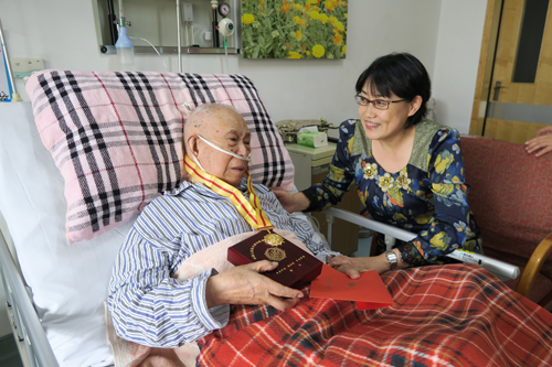 在中國人民抗日戰(zhàn)爭暨世界反法西斯戰(zhàn)爭勝利70周年紀(jì)念日前夕,金屬所黨委副書記郝欣、副所長張健,在人事處處長關(guān)德慧和所辦副主任趙翔宇的陪同下,分別看望慰問了住沈的六位抗戰(zhàn)時期參加革命工作的離休干部,為他們佩戴上由中共中央、國務(wù)院、中央軍委頒發(fā)的中國人民抗日戰(zhàn)爭勝利70周年紀(jì)念章,并送去慰問金。