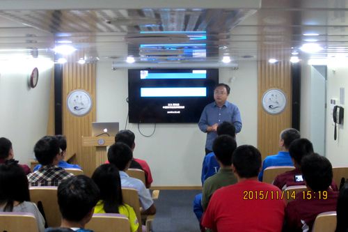 11月14日,海洋所黨委書(shū)記、熱帶西太平洋主流系和暖池綜合考察航次首席科學(xué)家王凡為完成科考任務(wù)正在返程途中的“科學(xué)”號(hào)全體黨員和入黨積極分子上了一堂精彩的“三嚴(yán)三實(shí)”專題黨課。