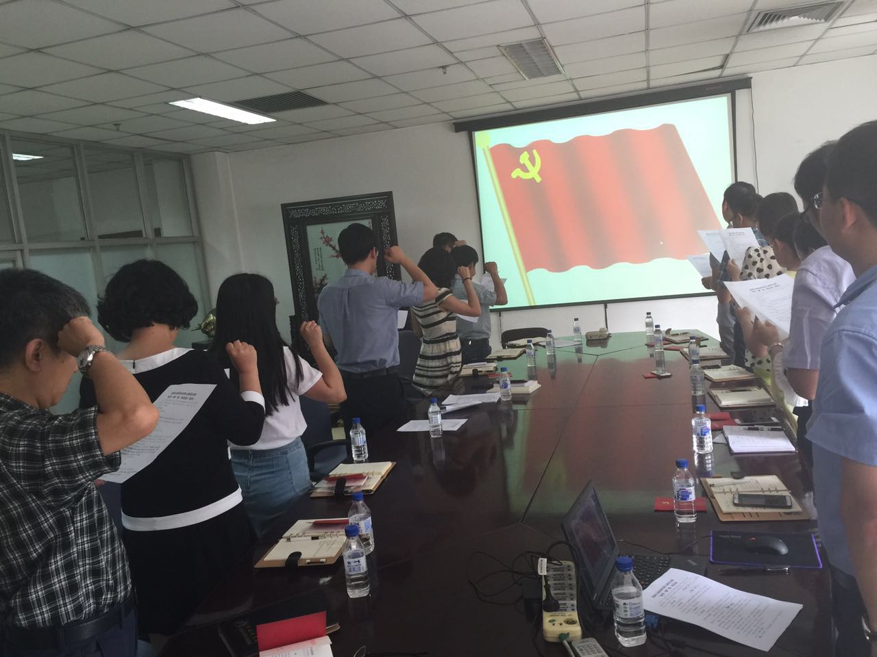 隨后,在支部書記周船的帶領(lǐng)下,全體支部黨員起立,面向黨旗高舉右手,重溫《入黨誓詞》。