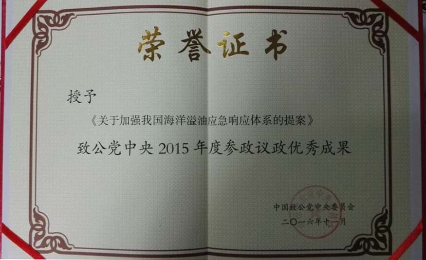 2016年11月,中國(guó)致公黨召開(kāi)參政議政工作研討會(huì),會(huì)議對(duì)參政議政成果進(jìn)行了表彰,其中由中國(guó)科學(xué)院煙臺(tái)海岸帶研究所王傳遠(yuǎn)副研究員執(zhí)筆,經(jīng)致公黨山東省委會(huì)報(bào)送的《關(guān)于加強(qiáng)我國(guó)海洋溢油應(yīng)急體系的提案》獲評(píng)致公黨中央2015年度參政議政優(yōu)秀成果。