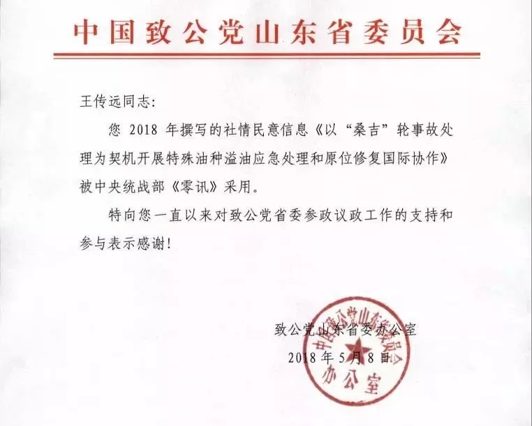 近日,中國科學院煙臺海岸帶研究所副研究員、致公黨山東煙臺萊山區(qū)支部副主委王傳遠提出的關于《以“桑吉”輪事故處理為契機開展特殊油種溢油應急處理和原位修復國際協(xié)作》的建議,被中共中央統(tǒng)戰(zhàn)部《零訊》采用并報黨和國家領導人參閱。