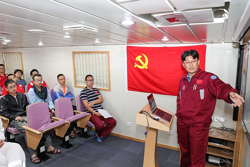 5月21日,正駛往馬里亞納海溝的“科學(xué)”號科考船上,“海上堡壘”臨時(shí)黨支部舉行“海洋強(qiáng)國 筑夢深藍(lán)”主題黨日活動,臨時(shí)黨支部全體黨員和部分科考隊(duì)員等40多人參加活動。