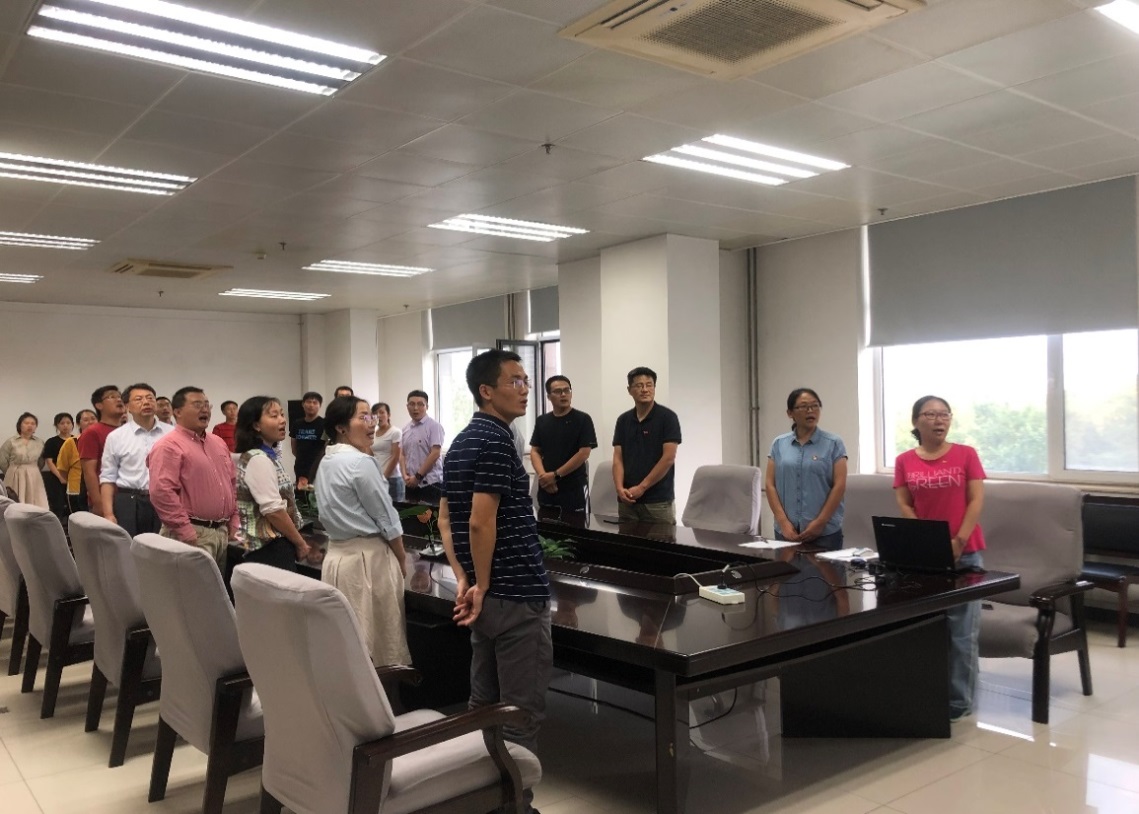 本次活動在全體人員嘹亮的國歌聲中開始,呂劍對本次活動的組織背景做了簡單介紹,并號召支部黨員同志弘揚愛國奮斗精神,堅守“創(chuàng)新科技、報國為民”初心開展科研工作。隨后,全體成員觀看了彩色影像資料《開國大典》,并合唱了《歌唱祖國》、《沒有共產(chǎn)黨就沒有新中國》和《我和我的祖國》三首歌曲,用歌聲表達(dá)了科研工作者對祖國的熱愛之情。