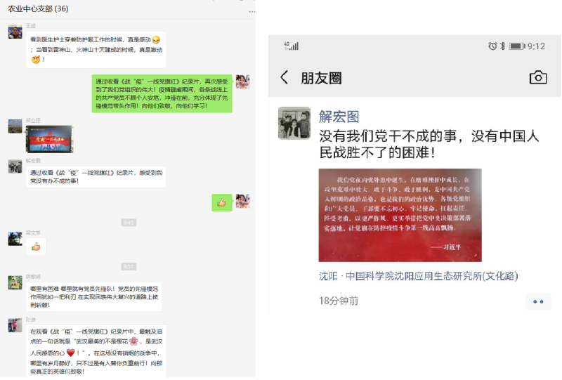 6月30日,作為七一特別黨課,所黨委還組織全所黨員在線觀看了紀(jì)錄片《戰(zhàn)“疫”一線黨旗紅》,黨員們受到的觸動很大,紛紛通過微信群交流觀影感受。