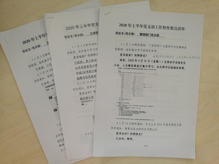 黨委辦公室集中梳理了上半年部署的重點(diǎn)工作任務(wù)19項(xiàng),按照部署時(shí)間、部署方式、具體要求完成的任務(wù)內(nèi)容和時(shí)間節(jié)點(diǎn),逐項(xiàng)列出清單下發(fā)各支部。8月10-14日,各黨總支、黨支部書(shū)記牽頭組織對(duì)照清單完成了全面自查,同時(shí)對(duì)照支部工作規(guī)范集中自查了“三會(huì)一課”記錄、黨費(fèi)收繳、發(fā)展黨員工作等檔案材料。