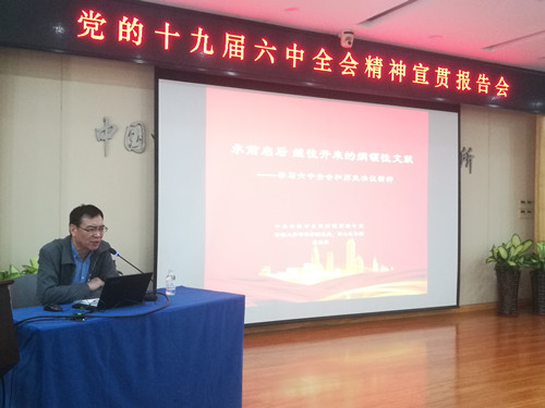 會議邀請到中共安徽省委講師團高端專家、安徽大學(xué)哲學(xué)學(xué)院教授、博士生導(dǎo)師裴德海做《承前啟后 繼往開來的綱領(lǐng)性文獻——學(xué)習(xí)六中全會和〈決議〉精神》專題報告。裴德海教授從“六中全會的議程和重大意義”“《決議》的主要內(nèi)容”“全面貫徹落實六中全會精神”三個方面對黨的十九屆六中全會精神和《決議》進行了全面宣講和深入解讀。報告主題鮮明、內(nèi)容豐富,脈絡(luò)清晰、思想深刻,對全面理解和把握黨的十九屆六中全會精神具有重要的指導(dǎo)作用。