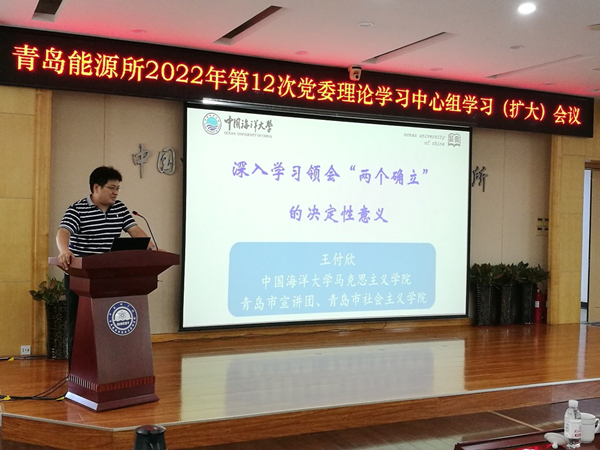 近日,青島能源所黨委召開理論學(xué)習(xí)中心組學(xué)習(xí)(擴大)會議,邀請中國海洋大學(xué)馬克思主義學(xué)院黨委副書記、副院長王付欣教授以《深入學(xué)習(xí)領(lǐng)會“兩個確立”的決定性意義》為題做黨史學(xué)習(xí)教育專題輔導(dǎo)報告。研究所黨委委員、黨支部書記、中層干部參加了會議,會議由黨委書記彭輝主持。