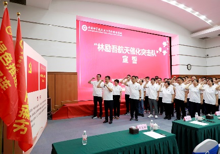 在宣誓環(huán)節(jié),“林勵(lì)吾航天催化突擊隊(duì)”全體隊(duì)員來到臺(tái)前列隊(duì),面向黨旗、隊(duì)旗莊嚴(yán)宣誓,立志要弘揚(yáng)老一輩科學(xué)家精神,傳承新時(shí)代科學(xué)家精神,集智攻關(guān)航天航空催化重大科學(xué)難題,發(fā)揚(yáng)“嚴(yán)肅認(rèn)真、周到細(xì)致、穩(wěn)妥可靠、萬無一失”的航天精神,努力搶占科技制高點(diǎn),為建設(shè)科技強(qiáng)國、實(shí)現(xiàn)高水平科技自立自強(qiáng)貢獻(xiàn)力量。