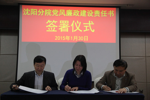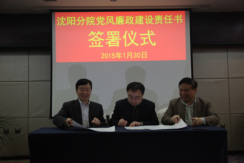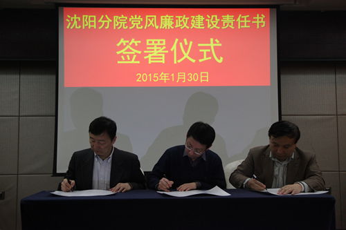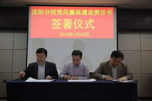 2015年1月30日,沈陽分院組織與系統(tǒng)各研究所簽訂黨風廉政建設責任書。受院黨組委托沈陽分院院長韓恩厚、黨組書記王啟堯與各研究所所長、黨委書記分別簽訂了個性化反腐倡廉建設責任書、黨風廉政建設責任書,同時與分院領導班子其他兩位成員也簽訂了個性化責任書。沈陽分院黨組副書記、紀檢組長徐巖主持責任書簽訂儀式。