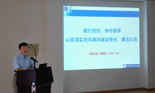 7月28日,沈陽分院組織分院系統(tǒng)所級領(lǐng)導(dǎo)干部進行了反腐倡廉專題學(xué)習(xí),沈陽分院院長韓恩厚作了《履行責(zé)任、爭做表率 認真落實黨風(fēng)廉政建設(shè)責(zé)任、廉潔從政》的廉潔從業(yè)專題報告,沈陽分院分黨組副書記、紀檢組組長徐巖作了《學(xué)習(xí)貫徹院2016年反腐倡廉工作匯報研討會精神,切實落實“兩個責(zé)任”》的報告,分院領(lǐng)導(dǎo)班子成員、系統(tǒng)各研究所、轉(zhuǎn)制公司領(lǐng)導(dǎo)班子成員及分院機關(guān)有關(guān)同志共計40余人參加了學(xué)習(xí)。