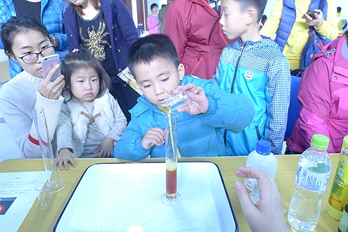 同學(xué)們?cè)谥驹刚咧笇?dǎo)下動(dòng)手操作海洋科學(xué)小實(shí)驗(yàn)