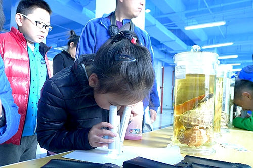 由海洋所組織的“藍(lán)色海洋嘉年華”板塊主要包括海洋生物標(biāo)本展示區(qū)、微觀世界探秘區(qū)、海洋科學(xué)實(shí)驗(yàn)區(qū),吸引了大量學(xué)生及家長(zhǎng)前來(lái)參觀體驗(yàn)。其中,最吸引同學(xué)們的是可以親自動(dòng)手參與的海洋科學(xué)小實(shí)驗(yàn)。博士實(shí)踐團(tuán)的志愿者們隨時(shí)為同學(xué)們提供指導(dǎo),讓同學(xué)們?cè)诎踩?guī)范的操作下,親手參與制作藻類(lèi)標(biāo)本、大象牙膏、海底火山、海水撈鹽、筆帽潛水艇等科學(xué)小實(shí)驗(yàn),還可通過(guò)顯微鏡觀察線蟲(chóng)、放射蟲(chóng)等玻片標(biāo)本,探索神秘的海洋世界。大家十分高興的是可以將親手制作的藻類(lèi)標(biāo)本塑封帶走,留作紀(jì)念?!拔覀儗?zhuān)門(mén)奔著你們的科學(xué)小實(shí)驗(yàn)來(lái)的,孩子特別喜歡這些能自己動(dòng)手操作的小實(shí)驗(yàn),既能鍛煉孩子的動(dòng)手能力,又能讓孩子學(xué)到科學(xué)知識(shí)”。一位學(xué)生家長(zhǎng)這樣說(shuō)。