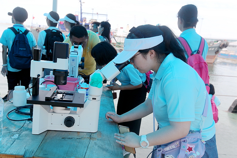 營(yíng)員通過(guò)顯微鏡觀察浮游生物