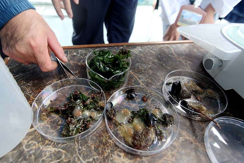 科研人員現(xiàn)場(chǎng)展示實(shí)驗(yàn)培養(yǎng)的海洋污損生物