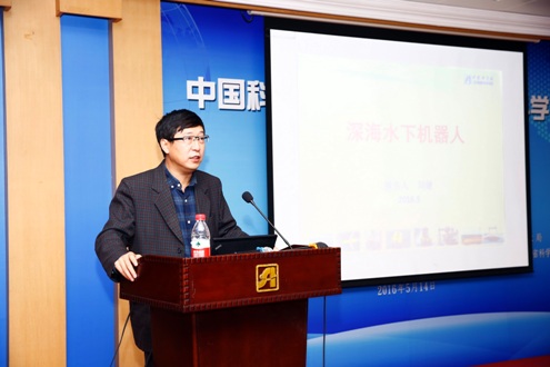 “潛龍二號(hào)”總設(shè)計(jì)師、沈陽自動(dòng)化研究所劉健研究員做了題為《深海水下機(jī)器人》科普?qǐng)?bào)告,介紹國內(nèi)外水下機(jī)器人的研究成果,特別介紹了“潛龍二號(hào)”研發(fā)過程,與聽眾分享了大洋40航次實(shí)驗(yàn)的苦與樂,并介紹了機(jī)器人發(fā)展的未來。報(bào)告后,劉老師與現(xiàn)場(chǎng)學(xué)生進(jìn)行了精彩的互動(dòng),博得了同學(xué)們一陣陣熱烈的掌聲。
