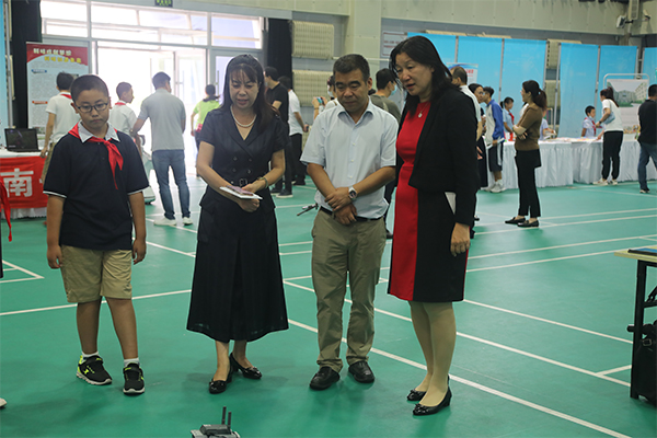 在渾南區(qū)中小學(xué)??萍冀逃晒怪?,渾南區(qū)各中小學(xué)代表展示了暑期科技實踐成果,馬越紅與鄭向東一同聽取了學(xué)生代表的講解并向同學(xué)們表達(dá)了鼓勵和肯定。