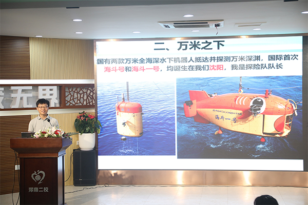 “科學(xué)家進(jìn)校園”活動中,唐元貴作了題為“以科技力量探索萬米神秘海洋”的科普報告,通過講解、視頻、圖片等方式為同學(xué)們生動全面地講解了“海斗號”與“海斗一號”萬米深潛的過程,揭開萬米海底的神秘面紗。通過唐元貴的講解,極大地激發(fā)了同學(xué)們對探索科學(xué)的興趣,樹立了榜樣,并讓同學(xué)們深刻體會到了科學(xué)家科技報國、勇于擔(dān)當(dāng)?shù)木瘛?/p>