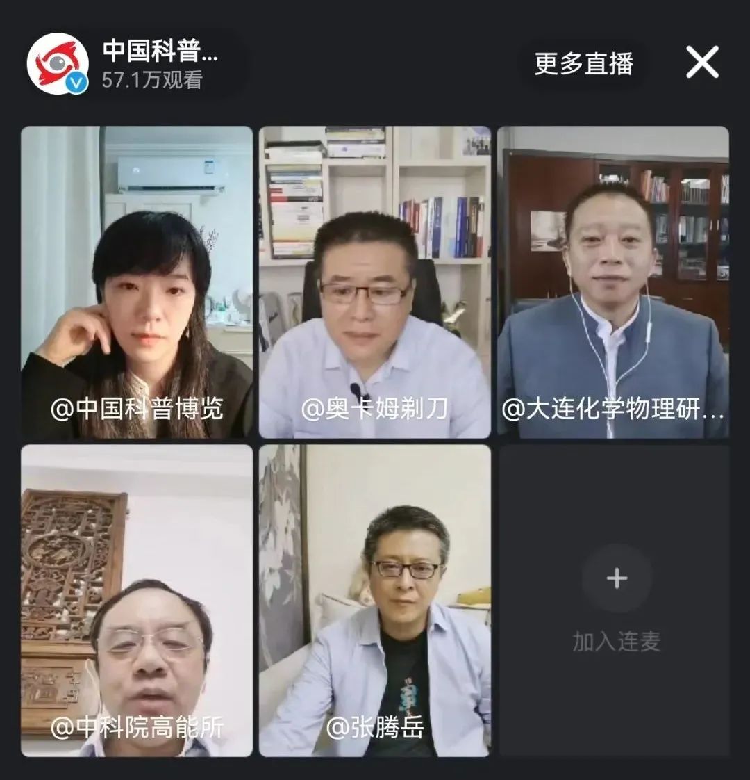 5月21日,大連化物所公眾科學(xué)日在“云”上舉行。在“云游化物所”環(huán)節(jié)中,主播們帶領(lǐng)公眾學(xué)習(xí)了中科院“基礎(chǔ)研究十條”,全方位云游所展館,了解大連化物所的研究成果,探尋科學(xué)背后的故事。在“科學(xué)實(shí)驗(yàn)秀”環(huán)節(jié)中,《可樂(lè)“大爆炸”》、《消失的顏色》、《流動(dòng)的電池》一個(gè)個(gè)神奇的科學(xué)“魔術(shù)”,深入淺出地解釋其中蘊(yùn)含的科學(xué)道理。當(dāng)晚,由中科院公眾科學(xué)日和中國(guó)科普博覽特別策劃的“今夜,我們關(guān)心科學(xué)”大咖連麥暢聊環(huán)節(jié)中,大連化物所劉中民院士、高能所王貽芳院士、央視主持人張騰岳、知名科普博主奧卡姆剃刀共同參與聊聊關(guān)于科學(xué)的那些事,一個(gè)半小時(shí)的對(duì)談,吸引了幾十萬(wàn)名網(wǎng)友觀看,為公眾帶來(lái)更多的科學(xué)思考和樂(lè)趣。