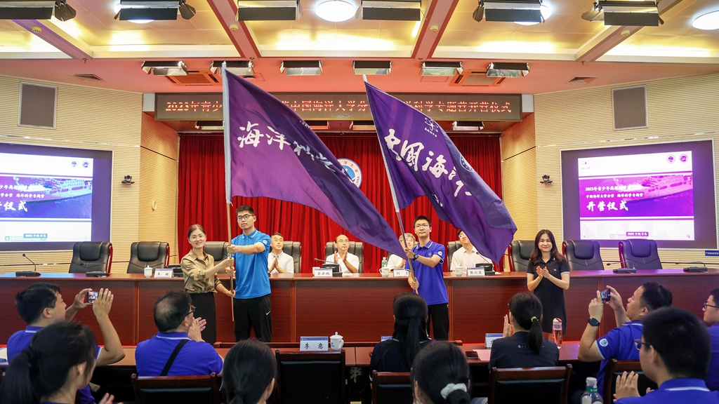 中國科學院海洋研究所綜合管理處副處長王敏、中國海洋大學科學技術處副處長宋欣共同為海洋科學專題營、中國海洋大學分營營員代表授旗。