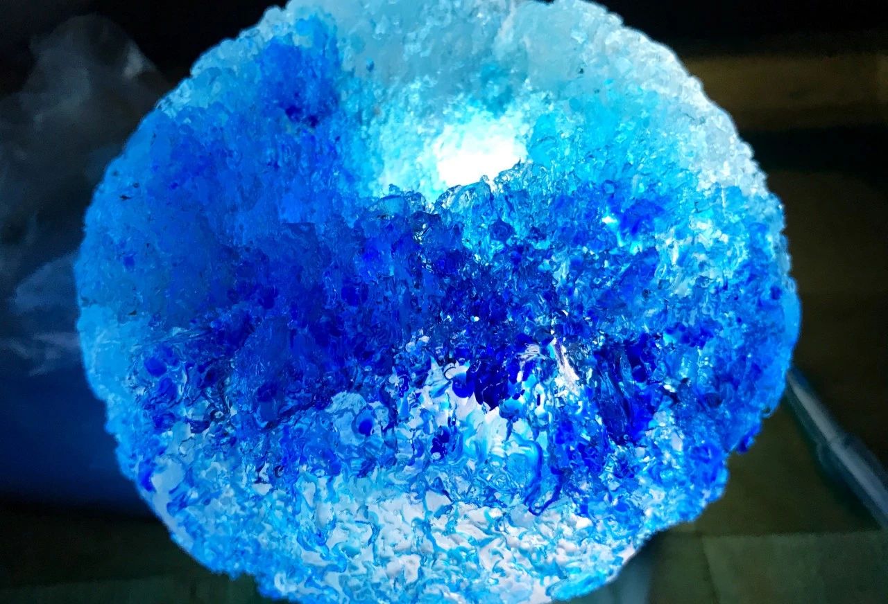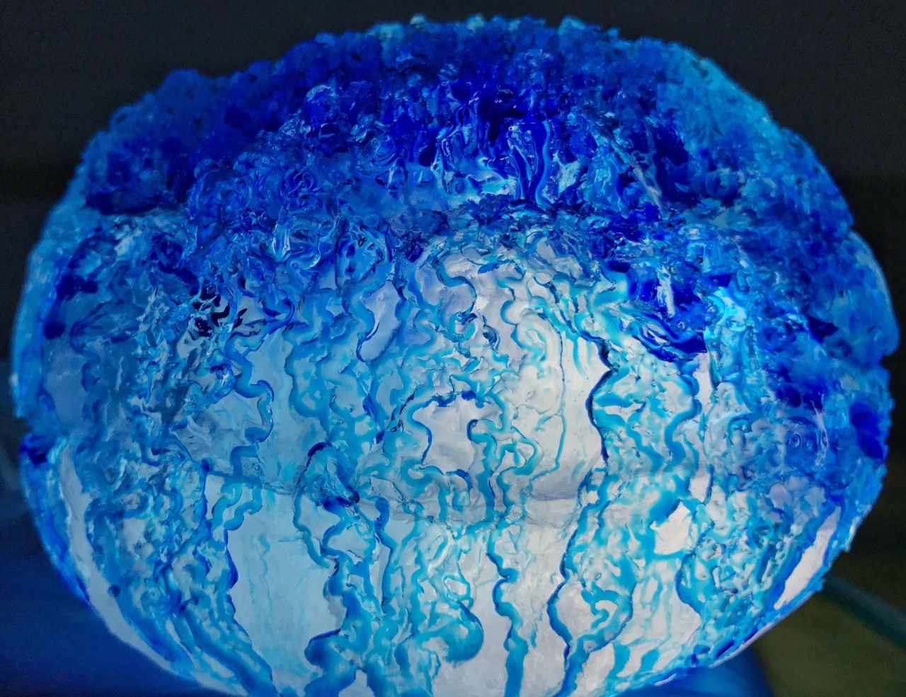 在我們的實驗中,加入食鹽,使并表面的鹽水的凝固點變得更低,無法結(jié)成冰。在左邊的加入食用色素會讓食鹽快速溶解,會使冰表面的圖案更加明顯。當(dāng)鹽水流過冰球表面時,會使冰融化,在冰球表面形成通道,像河流的河道一樣。當(dāng)鹽水被困在一個位置時,例如在右邊的冰球的情況下,它會侵蝕一條通徑直向下的通道。