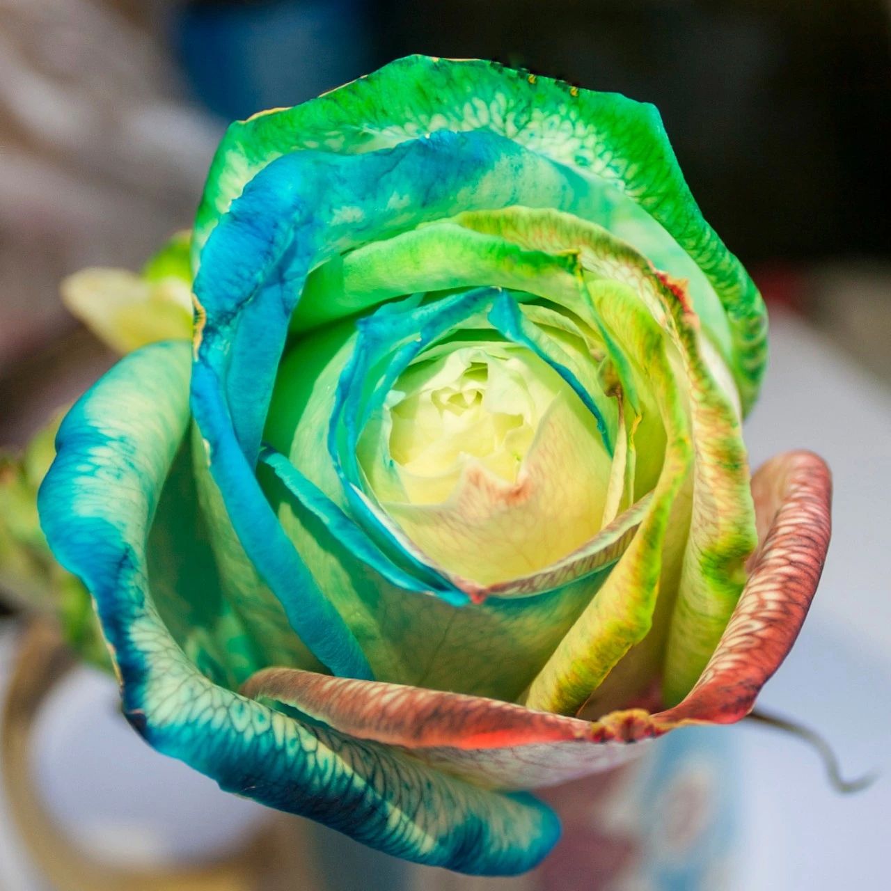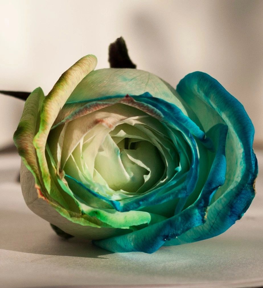 蒸騰作用是水分從活的植物體表面(主要是葉子)以水蒸汽狀態(tài)散失到大氣中的過程。染色液首先通過毛細(xì)作用被吸入到玫瑰的莖中,再由葉片和花瓣的蒸騰作用將染色液從莖部帶到花瓣。在染色液中浸泡1-2小時后,在花瓣邊緣附近清晰地顯示染色斑點(diǎn),水分蒸發(fā)但是色素卻不會蒸發(fā),留在了白色的花瓣上。被拉起的水經(jīng)歷一個稱為蒸騰的過程,即來自葉子和花瓣的水蒸發(fā)。隨著時間的推移,莖部和葉片也被染成深色,特別是樹葉分岔的地方。