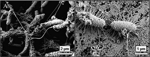 (掃描電鏡下鋼材上附著的微生物,引自“Sherar B,et al.Corros. Sci, 2011, 53: 955-960”)