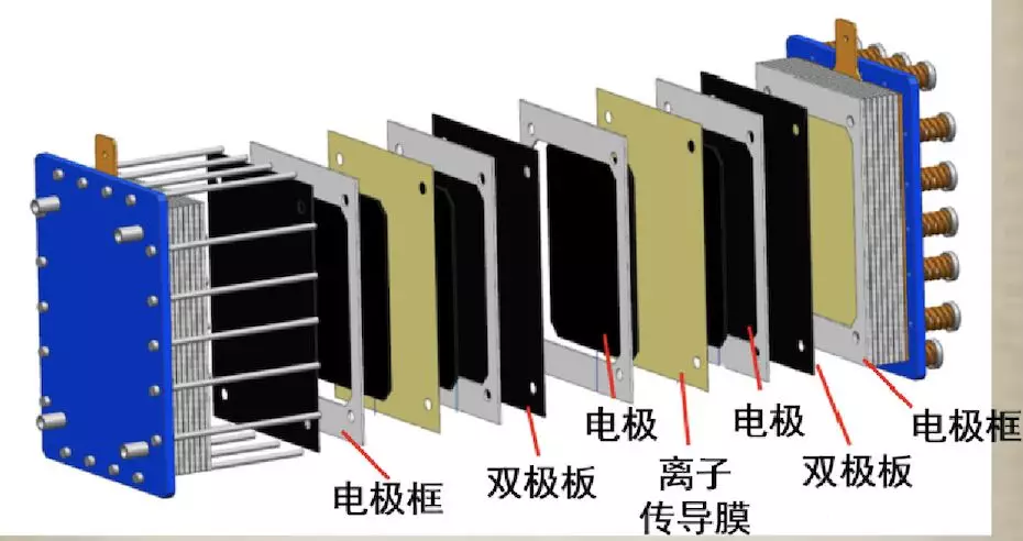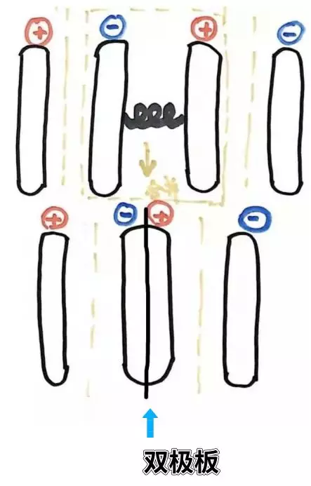 但是如果要串聯(lián)很多單電池,這樣做就太麻煩了,我們可以用一塊導(dǎo)電板替代導(dǎo)線,導(dǎo)電板一面與正極接觸,另一面與相鄰單電池的負極接觸,所以稱之為雙極板;工作時,電子通過雙極板直接傳導(dǎo)至相鄰單電池,這樣既節(jié)省了空間又縮短了電子的傳導(dǎo)路徑,降低了電池的內(nèi)阻。