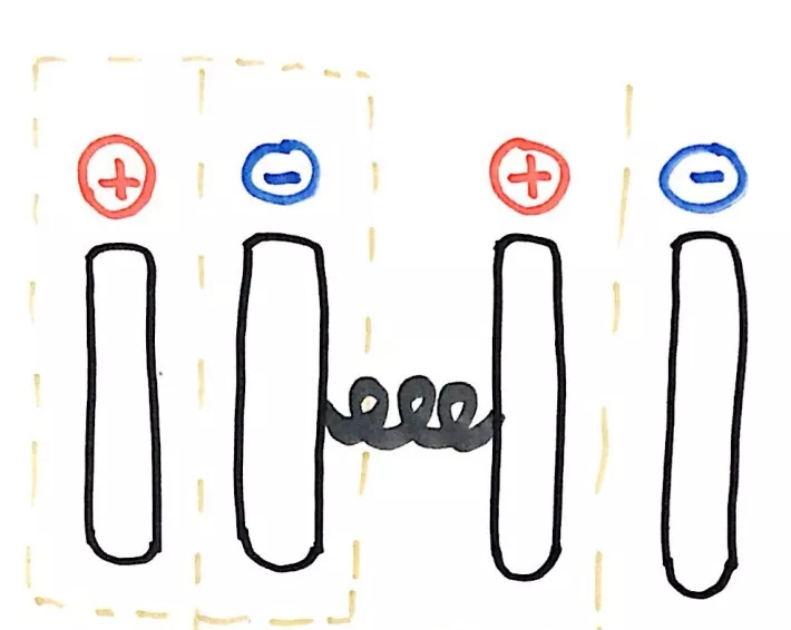 “如果簡單地把兩個電池串聯(lián),我們可以用一根導(dǎo)線連接相鄰電池:”
