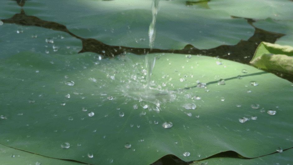 荷花之所以能出淤泥而不染,荷葉扮演著重要的清潔工角色。這是因為荷葉表面具有超強(qiáng)的疏水能力,雨水打在荷葉上時,并不能沾在荷葉上攤成一片,而是凝聚成一個一個的小水珠,迅速在荷葉上滾落,同時帶走了荷葉表面上沾染的淤泥灰塵等污垢,使得荷花終其一生都能皎潔無暇。