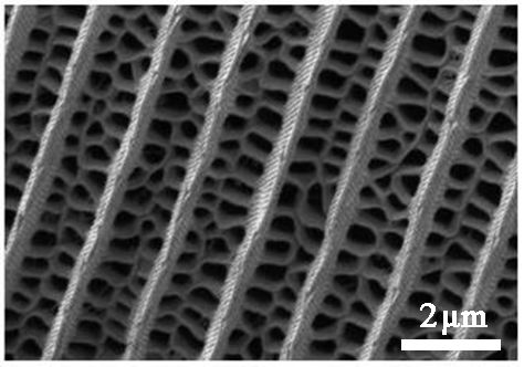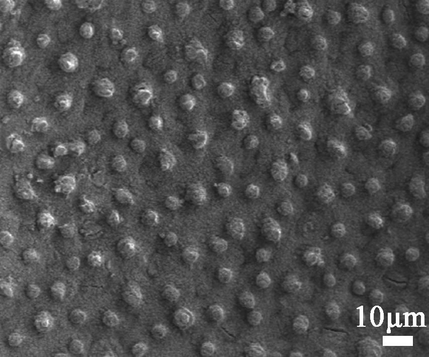 當(dāng)放大到10000倍時,可以進(jìn)一步看到平行的脊脈之間,不規(guī)則地排布著類似蜂窩狀的凹坑結(jié)構(gòu),脊脈間的距離大概為1.8微米,蜂窩狀凹坑的尺寸大致為0.9微米。