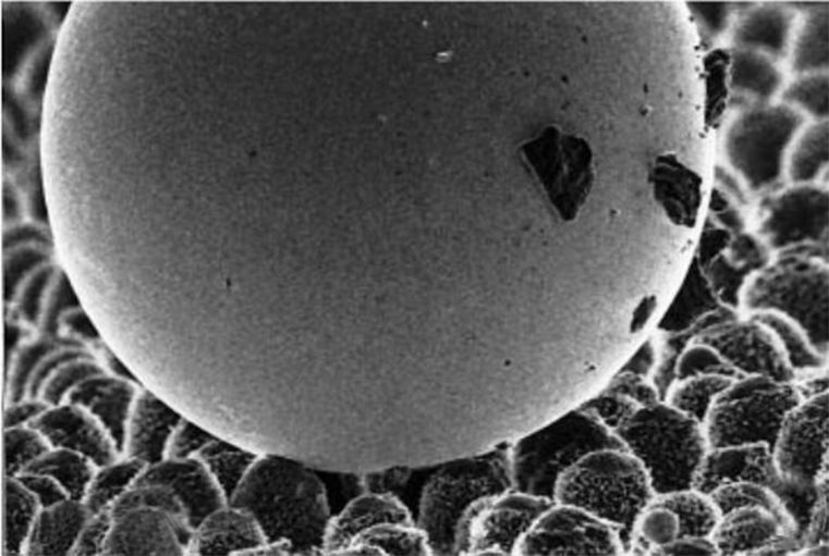 如果我們把每個乳突看成一座山峰,乳突與乳突之間就會形成山谷。只是這山峰和山谷的尺寸僅有10微米左右大小。而山谷中充滿了空氣,形成了大量的彼此相連的氣墊,和乳突形成的山峰一起托舉著水滴,使其不能在荷葉表面攤開浸潤,而是凝聚成一個一個的小水珠。此時,荷葉表面上如果有淤泥灰塵等污垢,就會黏在水珠上面,跟著水珠順著荷葉表面一起滑落下去。而在自然界,清理這些污垢的水源一場雨就已經(jīng)足夠,或者是霧氣凝結(jié)成的水滴。