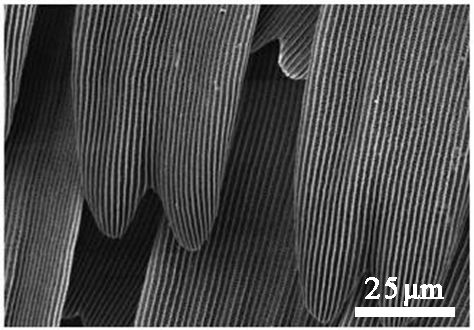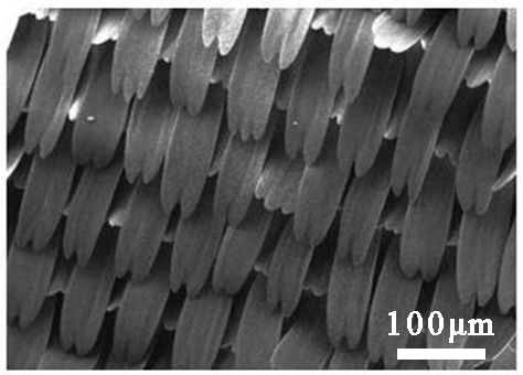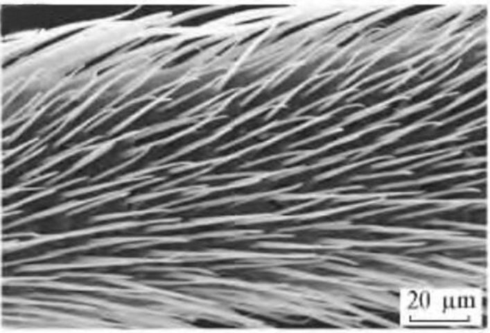 謎底就藏在水黽的腿部。當(dāng)把水黽的腿放大來看時,可見他的腿上均勻排列著長度在20微米左右的剛毛。