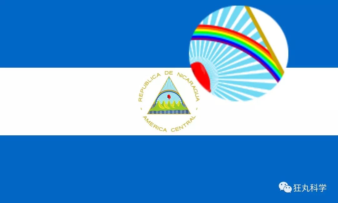 1971年開始采用的尼加拉瓜國(guó)的國(guó)旗,正中間的三角形區(qū)域中的彩虹,最下方一條為深紫色。