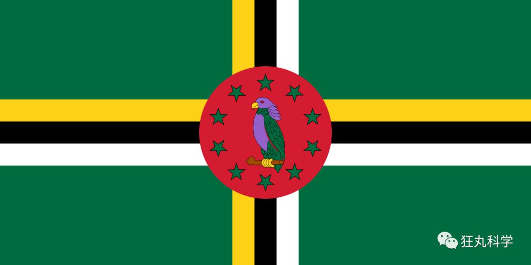 1978年啟用的多米尼克國(guó)旗正中間的鸚鵡,頭部和腹部采用了淡紫色。