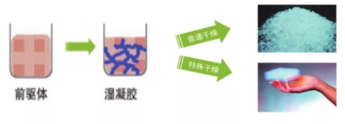 氣凝膠的制備過程分為兩步:1.制備濕凝膠;2.將濕凝膠通過特殊手法干燥。濕凝膠最傳統(tǒng)的制備方法是溶膠-凝膠法。將含高化學活性組分的化合物分散在溶劑中,經(jīng)過水解反應生成活性單體,活性單體聚合,形成溶膠,進而生成具有一定空間結(jié)構的凝膠。此時制作出來的凝膠有點類似于我們平時吃的果凍,緊接著將果凍狀凝膠進一步進行干燥處理即可得到氣凝膠。由于表面張力的作用,通常狀態(tài)下,凝膠內(nèi)液體的揮發(fā)會使得凝膠脆弱的骨架坍塌。而通過冷凍干燥技術進行干燥可以很好的解決這一問題。將濕凝膠在低溫冷凍,接著置于真空條件下干燥。由于冷凍過程已經(jīng)使得凝膠內(nèi)的液體轉(zhuǎn)變?yōu)楣腆w,之后在真空環(huán)境中以升華的形式脫離凝膠骨架,這樣就可以避免了液體揮發(fā)造成骨架坍塌的問題,得到我們所期待的氣凝膠。