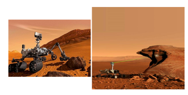 LIBS技術(shù)在地外探測中,最具影響力的是火星探測。于2011年11月發(fā)射,2012年8月成功登陸火星的“好奇者”號火星車主要采用了LIBS技術(shù)。科學(xué)家們將LIBS的激光發(fā)射與光譜采集裝置集成在火星車的“頭部”,在進(jìn)行物質(zhì)探測時,只需要發(fā)射一束激光束,就可以根據(jù)在目標(biāo)物質(zhì)表面產(chǎn)生的等離子體發(fā)射光譜來對目標(biāo)物質(zhì)成分進(jìn)行分析。
