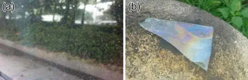 (a)公交車玻璃上的白霧、白點(diǎn)(b)彩虹斑(圖源:參考文獻(xiàn)4)