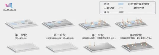 在春夏之交,氣溫和濕度逐漸升高,會使玻璃腐蝕的幾率大大增加。對于單純承受大氣物質(zhì)侵蝕的建筑物窗戶玻璃來說,其腐蝕可以分為四個階段[5]:
