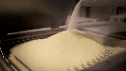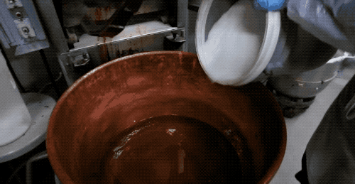 明膠做好了,我們做棉花糖的話,接著就要熬煮糖體了~在熱水中將明膠?;_,加入淀粉、糖、香料、色素等,利用機(jī)械的大力攪拌,在糖體內(nèi)沖入許多細(xì)密的氣泡,形成下圖粘稠的模樣來。