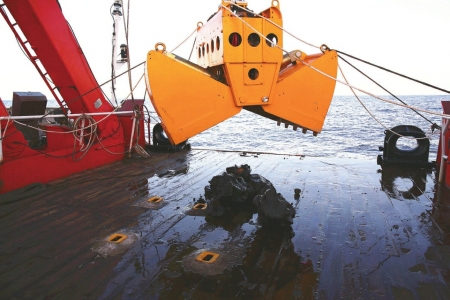 9日2時16分,電視抓斗下水。作為本航次第一抓,隊員們都期待能有所收獲和驚喜。經(jīng)過6次調(diào)整船的位置,4時47分,抓斗抓取樣品回船,共抓取到十余塊大小不一的巖石樣品。