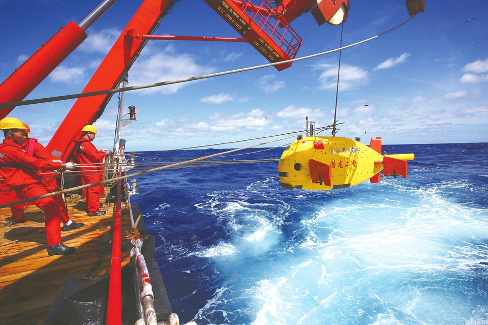 上圖為科考隊員正在布放“潛龍二號”