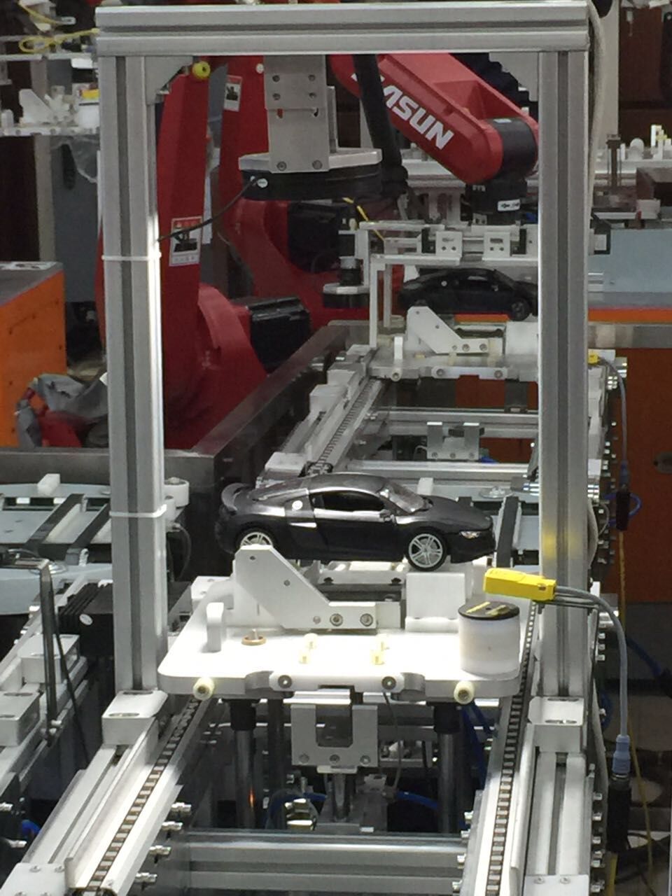 以模型車(chē)組裝為背景的智能制造示范產(chǎn)線,模擬了從消費(fèi)者下單到制造商生產(chǎn)交付的全過(guò)程 郝曉明攝