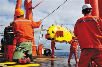 科考船“向陽紅10號(hào)”上,作業(yè)組多人從各個(gè)方向拉起“潛龍二號(hào)”,準(zhǔn)備入水。當(dāng)?shù)貢r(shí)間2月14日,西南印度洋,1.5噸重的“潛龍二號(hào)”下水開始進(jìn)行一天多的勘測。此次的勘探目標(biāo)是西南印度洋一塊30多平方公里熱液區(qū)的海底,機(jī)器人將沿著線路在海底來回橫掃,其攜帶的各種傳感器將采集各類信息。2月15日晚,完成任務(wù)浮出水面的“潛龍二號(hào)”被回收。從初步數(shù)據(jù)分析情況看,探測數(shù)據(jù)都被導(dǎo)出且基本有效,這意味著“潛龍二號(hào)”的首次試驗(yàn)性應(yīng)用任務(wù)成功完成。新京報(bào)特派記者 金煜 攝